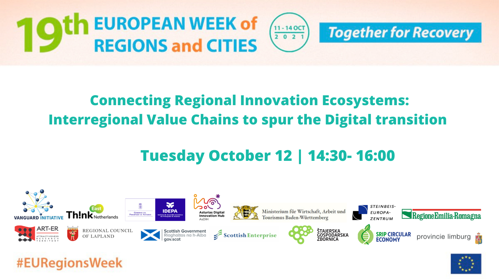 Vanguard Initiative, jointly with the VI Regions East Netherlands, Asturias, Baden Württemberg, East and North Finland, Emilia Romagna, Scotland, Slovenia, and South Netherlands is organising the event Connecting Regional Innovation Ecosystems: Interregional Value Chains to spur the Digital transition as part of the official programme of the European Week of Regions and Cities.
