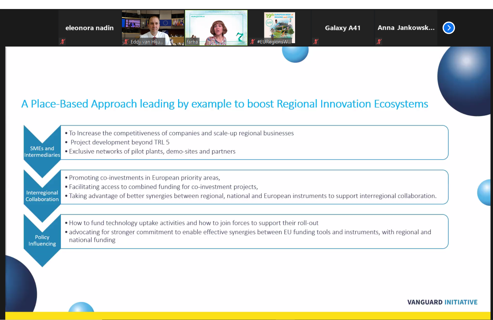 While Mrs Perrin outlined how the Horizon Europe and EIE calls will provide opportunities for the VI regions and their pilots, concrete examples of the VI collaboration through its pilot activities allowed to reflect on policy issues and aspects which are paramount to achieve interregional value chains to spur the digital transition. VI regions presented concrete examples and good practices on how regional Smart Specialisation Strategies can support the development of regional innovation ecosystems, and what strategy and initiatives should be implemented by a region to accelerate the digital transition of its regional innovation ecosystem.